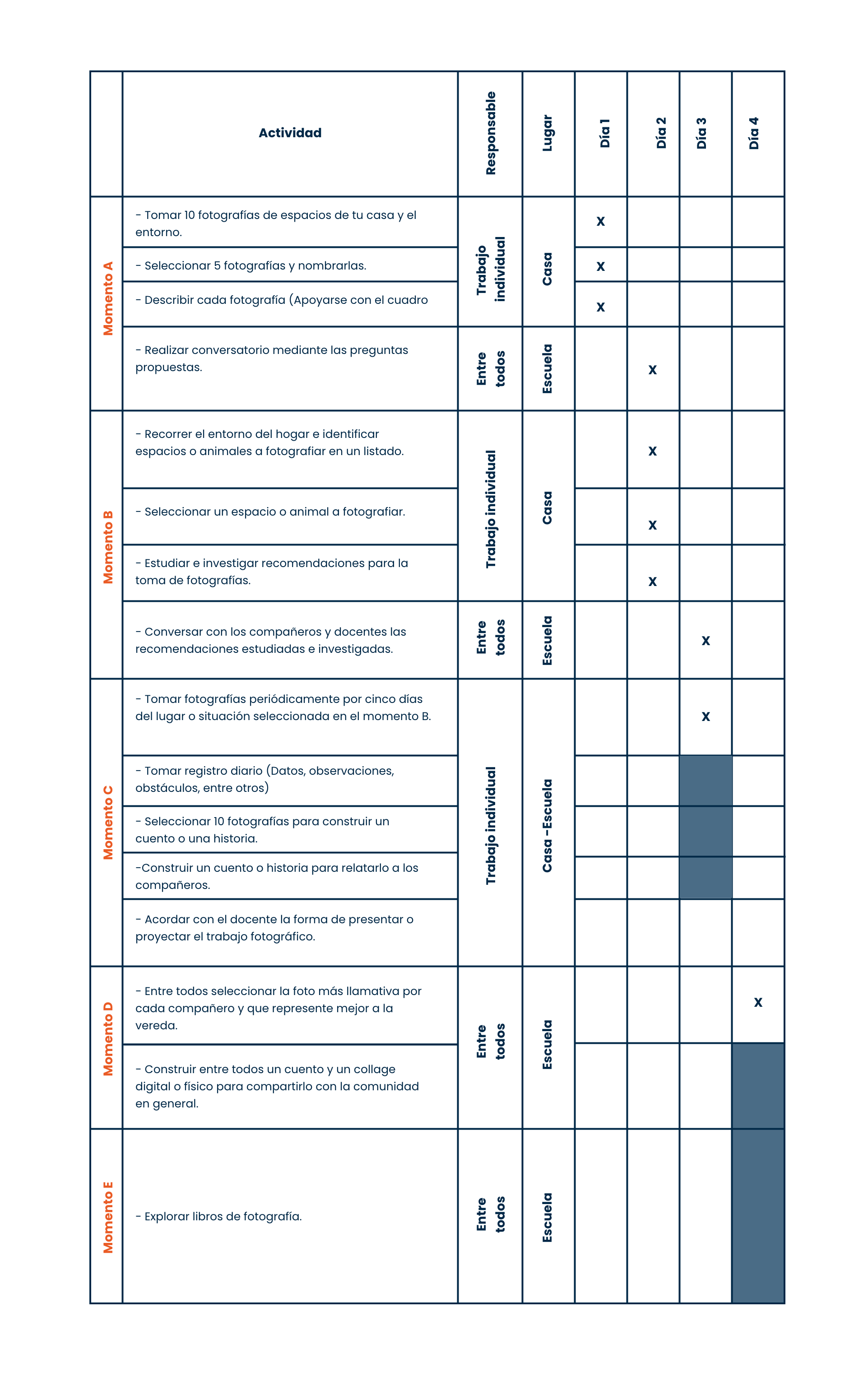Para el desarrollo del proyecto ten en cuenta el siguiente cronograma de actividades. Puedes dibujar esta tabla en tu cuaderno para ir registrando los avances del proyecto en cada uno de los momentos propuestos en la guía.
