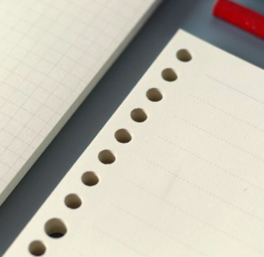 1. Perforamos las hojas, la portada y la contraportada, tal como lo muestra la imagen. Tratamos de que los agujeros tengan la misma distancia entre ellos y de que todas las hojas estén perforadas de la misma manera. Al poner todas las hojas juntas debemos poder ver a través de los agujeros.