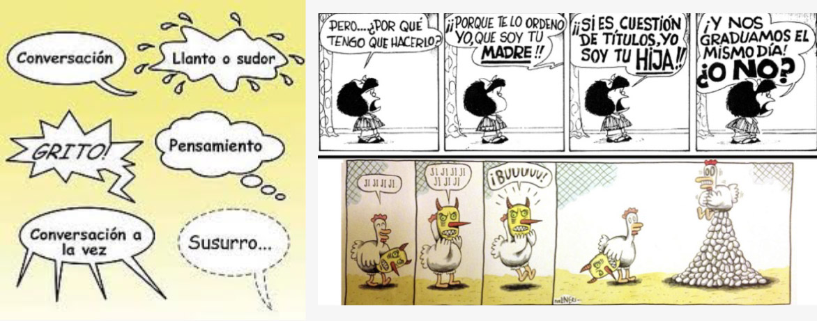 He aquí algunos ejemplos de lo que se utiliza para comunicar. Cuando uno de los personajes está pensando se utiliza un globo con bolas; cuando grita, un globo con puntas. Los tamaños de las letras también pueden ayudar a comunicar: unas letras más grandes pueden significar un volumen de voz elevado o un grito.